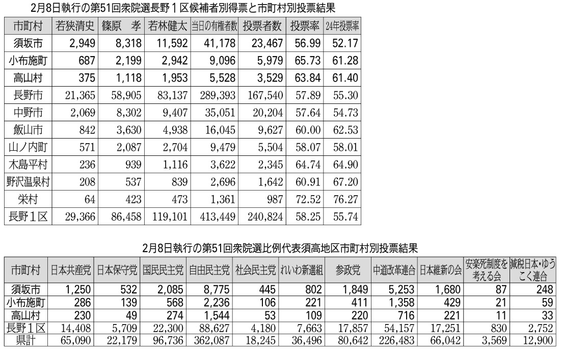 第51回衆議院議員総選挙は8日に投開票され、3人が争った長野1区(定数1)は、自由民主党元職の若林健太氏(62、長野市)が中道改革連合前職の篠原孝氏(77、中野市)らを抑えて2回目の当選を果たした。県内小選挙区(1〜5区)は自民が独占した。一方、日本維新の会新人の若狭清史氏(45、長野市)は、小選挙区で敗れたが、比例代表北陸信越ブロック(定数10)で議席を得て復活当選を果たした。2回目の挑戦で初当選比例代表は自民3、中道4、維新1、国民1、参政1。