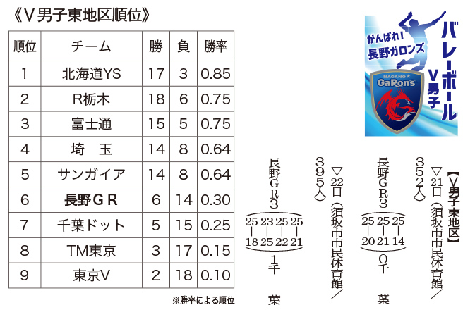 バレーボールVリーグ男子東地区の長野GaRons(ガロンズ)は21、22日、須坂市市民体育館で千葉ドットと対戦した。21日は3―0でストレート勝ちし、連敗を5でストップ。22日も3―1で破り、2連勝を飾った。通算6勝14敗で6位。
