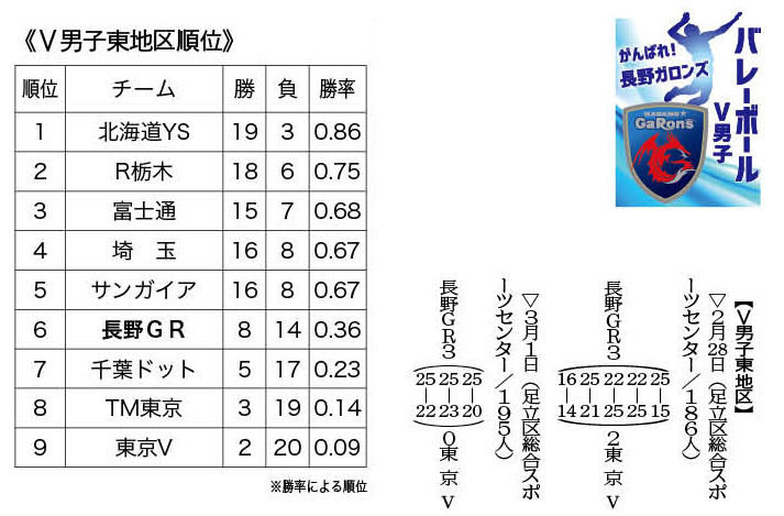 バレーボールVリーグ男子東地区の長野GaRons(ガロンズ)は2月28日と1日、東京・足立区総合スポーツセンターで東京ヴェルディと対戦した。初日にフルセットの末、3―2で競り勝つと、2日目は3―0でストレート勝ちした。連勝を4に伸ばした。通算8勝14敗で6位。