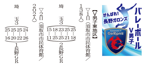 バレーボールVリーグ男子東地区の長野GaRons(ガロンズ)は1、2日、須坂市市民体育館で埼玉アザレアと対戦し、1日はフルセットの末に2―3、2日は1―3で敗れた。通算1勝3敗。白星で飾った開幕戦後、3連敗となった。