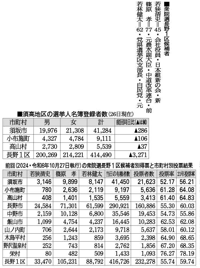 第51回衆議院議員総選挙は27日公示され、長野1区は前職・元職・新人の3氏が立候補した。2024(令和6)年10月の前回選と同じ顔ぶれ。届け出順に日本維新の会新人の若狭清史氏(45、長野市)、中道改革連合前職の篠原孝氏(77、中野市)、自由民主党元職の若林健太氏(62、長野市)。3氏は共に比例代表に重複立候補した。衆議院定数は465(小選挙区289、比例代表176)。過半数は233。選挙戦は来月7日までの12日間。投開票は8日。