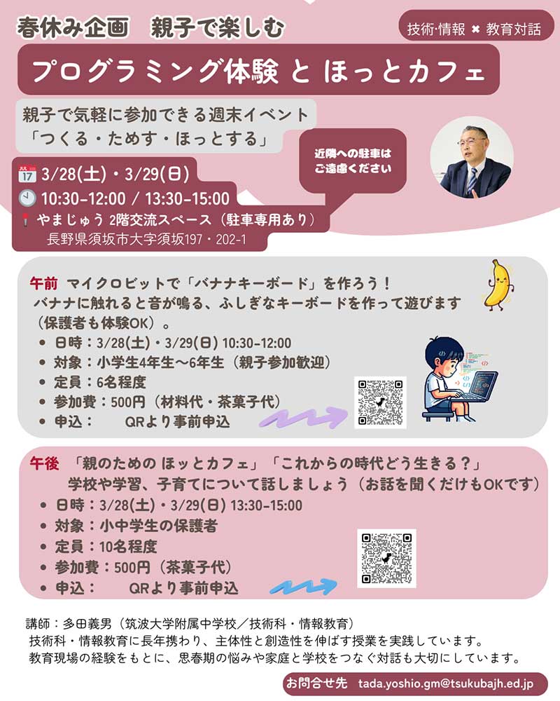 このイベントは、筑波大学附属中学校で技術・情報教育に長年携わる多田義男氏を講師に迎え、「つくる・ためす・ほっとする」をテーマに、午前と午後の二部構成で行われます。
