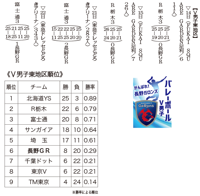 バレーボールVリーグ男子東地区は22日、今季レギュラーシーズンの全日程を終えた。須坂市に拠点を置く長野GaRons(ガロンズ)は8勝20敗で6位となった。