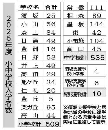 須高地区の小・中学校の入学式は6日(支援学校は7日)に行われた。今年は小学校509人(須坂市370人、小布施町95人、高山村44人)、中学校535人(須坂市386人、小布施町104人、高山村45人)、須坂支援学校10人(小学部4人、中学部6人)が、希望を胸に新たな学校生活をスタートさせた。